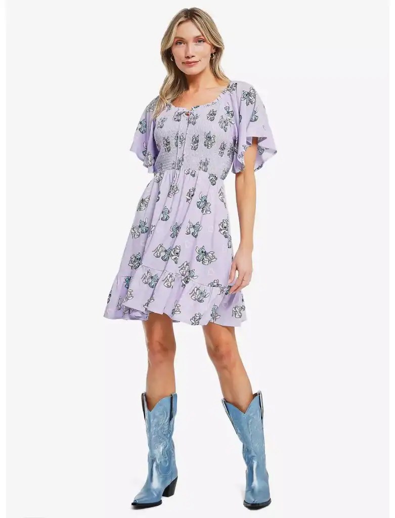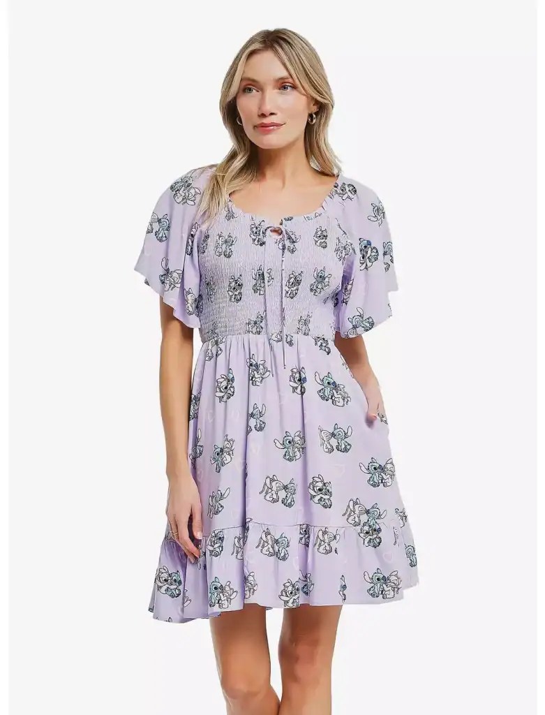 Whether you’re on the shores of Kauai or flying the Red One in outer space, this dress keeps you chic and comfortable! Inspired by Lilo & Stitch, the airy lavender fabric features an allover print of Angel and Stitch amid faint hearts, along with a front tie, smocked waist, and flowing short sleeves. It adds a Disney touch to any occasion!