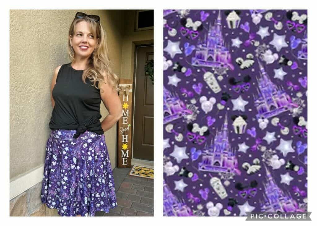 I liked the “ear”idescent color of Walt Disney World’s 50th anniversary. However, I LOVE the purple and platinum color scheme of the Disney100 celebration. Based on the sold-out status of the Disney100 ears, I know I’m not the only one! The Lost Princess Apparel skirt showcases the castle along with Disney favorites such as Starbucks and Platinum Ears.