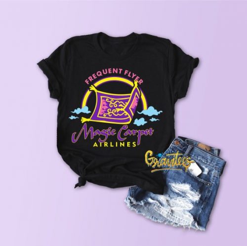 This Magic Carpet inspired shirt is perfect for 90s babies who grew up loving Aladdin! The bright purple, yellow, and pink of the design really pops against the solid black shirt. Across the top of the shirt reads “Frequent Flyer” and is followed by a bright and cheerful image of the Magic Carpet soaring through the clouds. Below reads “Magic Carpet Airlines.”