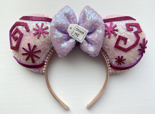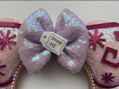 How fun are these pink teacup inspired ears?! I love the color, the sparkle, and the whimsy of these ears. They are the perfect piece to complete your Fantasyland inspired outfit or to top off any Alice Disneybound. The center of the bow features a little tag with “Drink Me” stitched in.