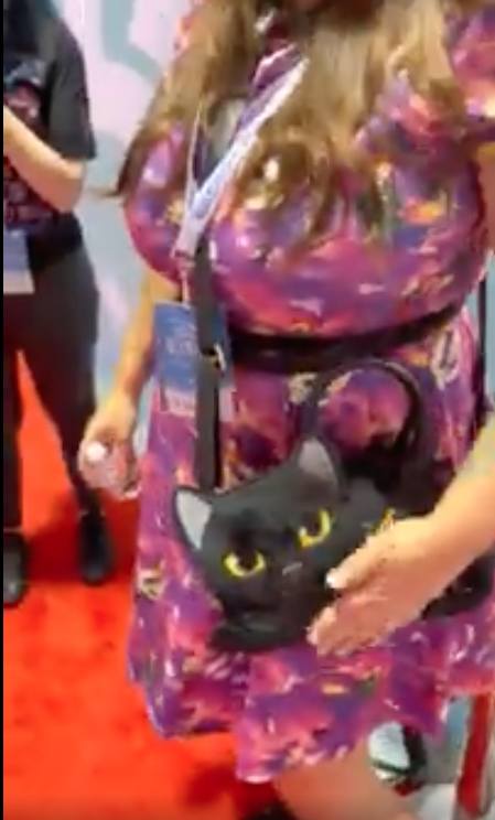 When I first arrived at the Loungefly booth, I noticed the Stitch Shoppe ensemble that Liz was wearing. It was the new Hocus Pocus merchandise from Stitch Shoppe by Loungefly! We looked at all the details of the dress and petted the bag. Yes. It’s a furry Thackery Binx bag. I loved it so much, I bought the outfit when I got home.