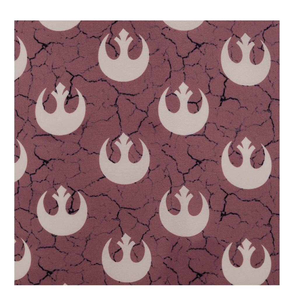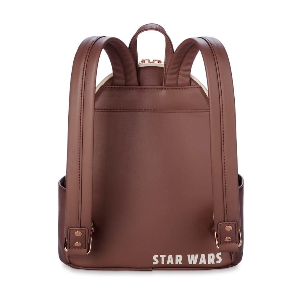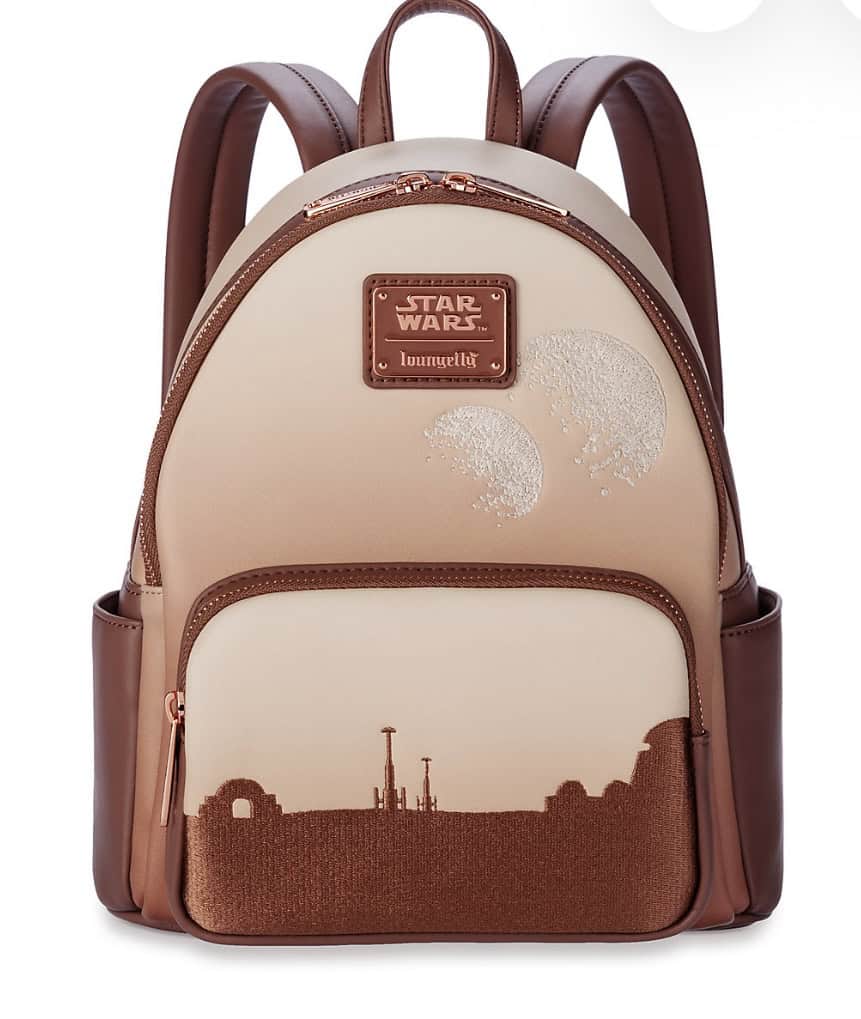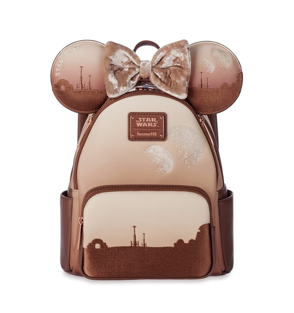 The coordinating backpack again features the iconic Tatooine scene. The versatile bag contains the newish feature of a front compartment. The feature includes a slip pocket with straps and snap fasteners to attach Ear Headbands. Not only is it helpful, but it converts the backpack to a Minnie bag! Neutrality continues on the interior lining with a brown and tan design featuring the Rebel Alliance logo.