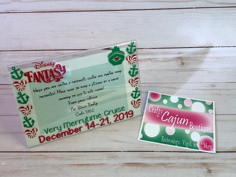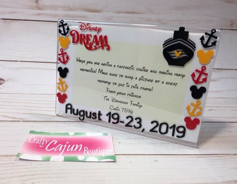 Help your fellow cruise guests commemorate their trip with these fun Disney Cruise Line inspired picture frames. Each 4×6 frame is personalized with your cruise ship and cruise dates. The frame holds a note which contains “From your friends the ________ family in cabin _______. Plus, these frames stack easily and are lightweight, which makes them good for travel! Get them on Etsy from CraftyCajunBoutique for $4 each.