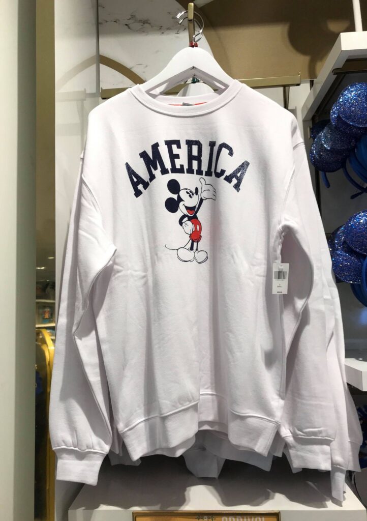 If you prefer a more classic-style sweatshirt, check out this Mickey Icon Pullover Sweatshirt. This white sweatshirt features Mickey Mouse gesturing happily to the word “America” in distressed athletic block lettering.