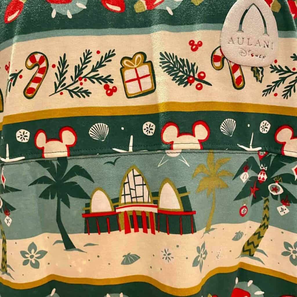 First up, we have to talk about this precious Spirit Jersey that, at first glance, looks just like the holiday Spirit Jersey we have already seen, but once you get a close look, you will notice that Hawaiian twist! You will spot the usual Mickeys, lights, presents, sweets, holly, and candy canes, but you can also spot Aulani, palm trees with ornaments, turtles, starfish, sand dollars, and seashells! The Aulani logo on the front chest and the words “Mele Kalikimaka” on the back complete the look!