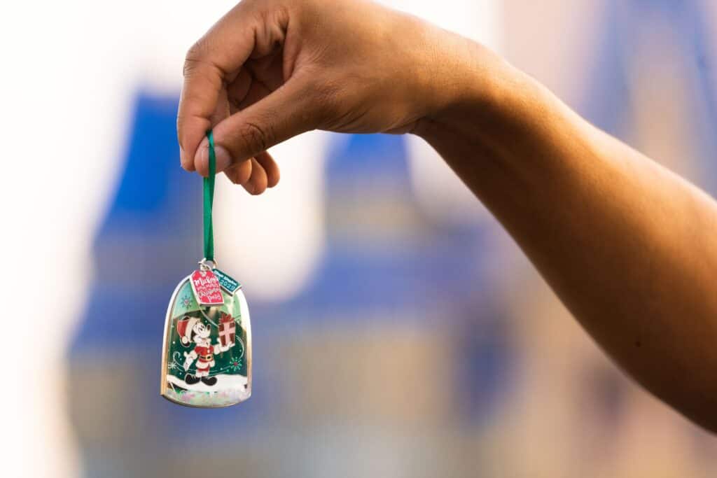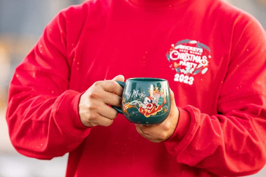 Collectibles include a precious green mug featuring “Holiday Magic” along with Santa Mickey with a sleigh full of toys (including a Duffy bear!) being pulled by one of the adorable reindeer and surrounded by Mickey snowflakes! You can even spot tags on the gifts featuring the party logo and “Magic Kingdom 2023!”