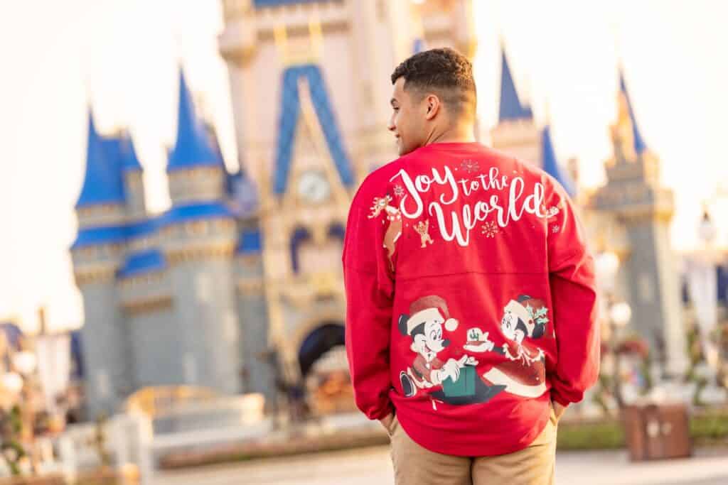 First up we have to talk about the fabulous Spirit Jersey! I absolutely love the bright red! You can’t go wrong with this classic Christmas color, and this one even has a little gold sparkle to add to the Christmas magic! The back features the words “Joy to the World” surrounded by Mickey Snowflakes and parade favorites like the reindeer, toy soldier, and even a gingerbread man across the shoulder! The lower back features Mickey and Minnie dressed in their Christmas best with them opening a gift with a castle snow globe inside! The front chest features the Christmas party logo along with plenty of little hidden Mickey details!