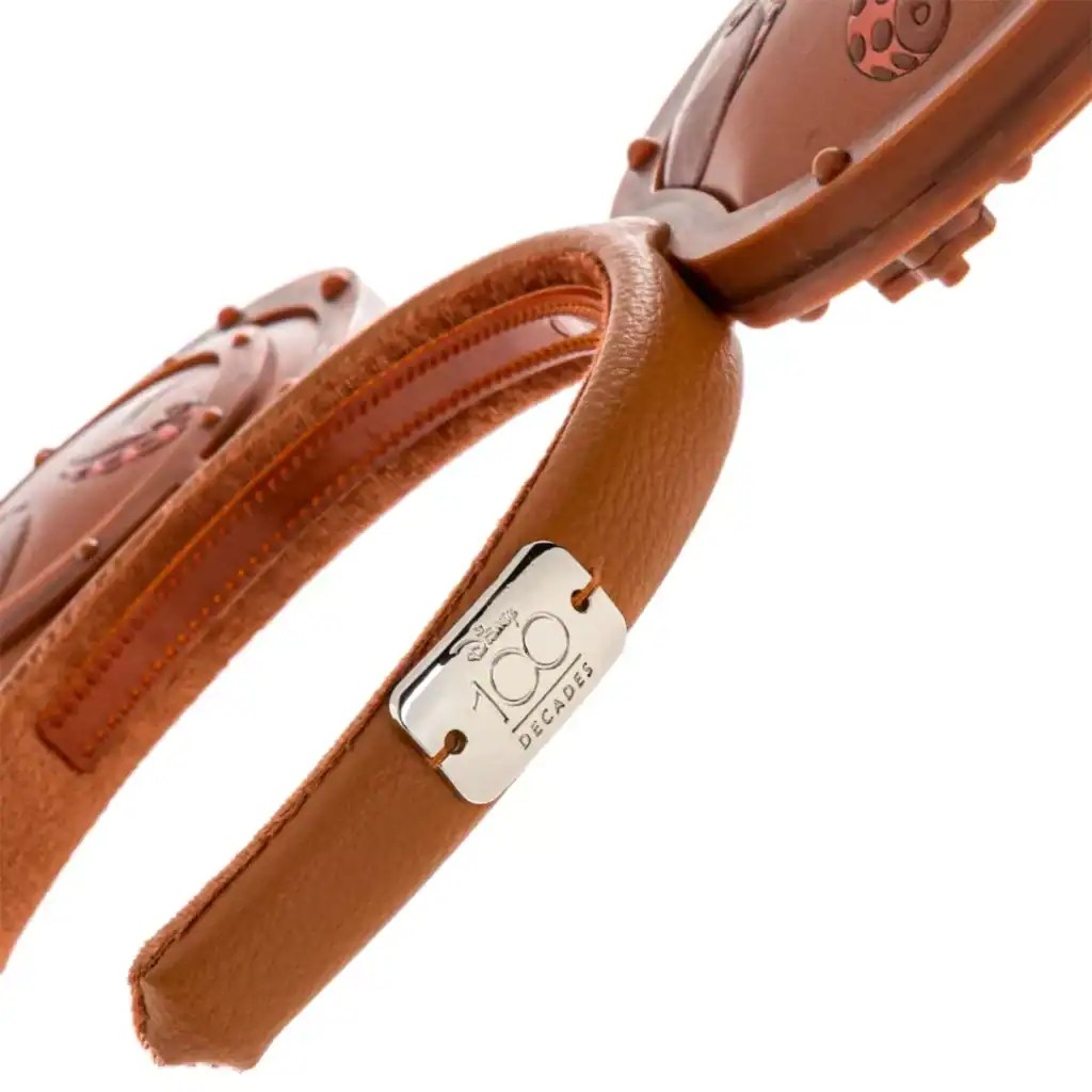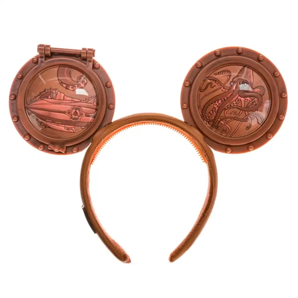 First up are the fabulous 20,000 Leagues Under the Sea Ears! We didn’t know what these were going to look like during the preview, but they have surpassed my expectations! They feature simulated leather ears with portholes where you can spot a giant squid attacking in one ear and a “bubble” window that can be opened and closed to view the Nautilus in the other! On the back, the ears feature the squid’s tentacles and a Nautilus “N!” You can also spot the Disney100 logo on the side of the headband!
