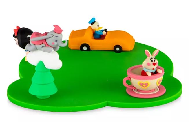 This mug and saucer is two separate pieces that come together for one adorable combination. The mug features a white background, magical and smiling castle, Mickey mouse balloons, fireworks, and other Disney icons. It then sits on top of the adorable saucer that features the White Rabbit, Dumbo, Donald Duck, and more.