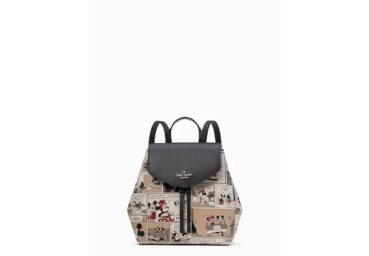 Take the joy of Mickey and Minnie with you wherever you go with this Minnie Mouse Flap Backpack. It features a metal pin mount with Kate Spade logo, a flap with magnetic snap and drawstring closure, and two interior zip closure pockets.