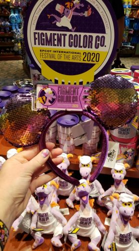 Of course the Minnie ears we have to dive right into. These beauties are fantastic, and feature the first reversible sequin Minnie ears from the Disney Parks! One direction of the sequins is purple, while the reverse side creates rainbow sequins! The band is topped off with Figment and a paint roller with the festival logo, instead of a bow.