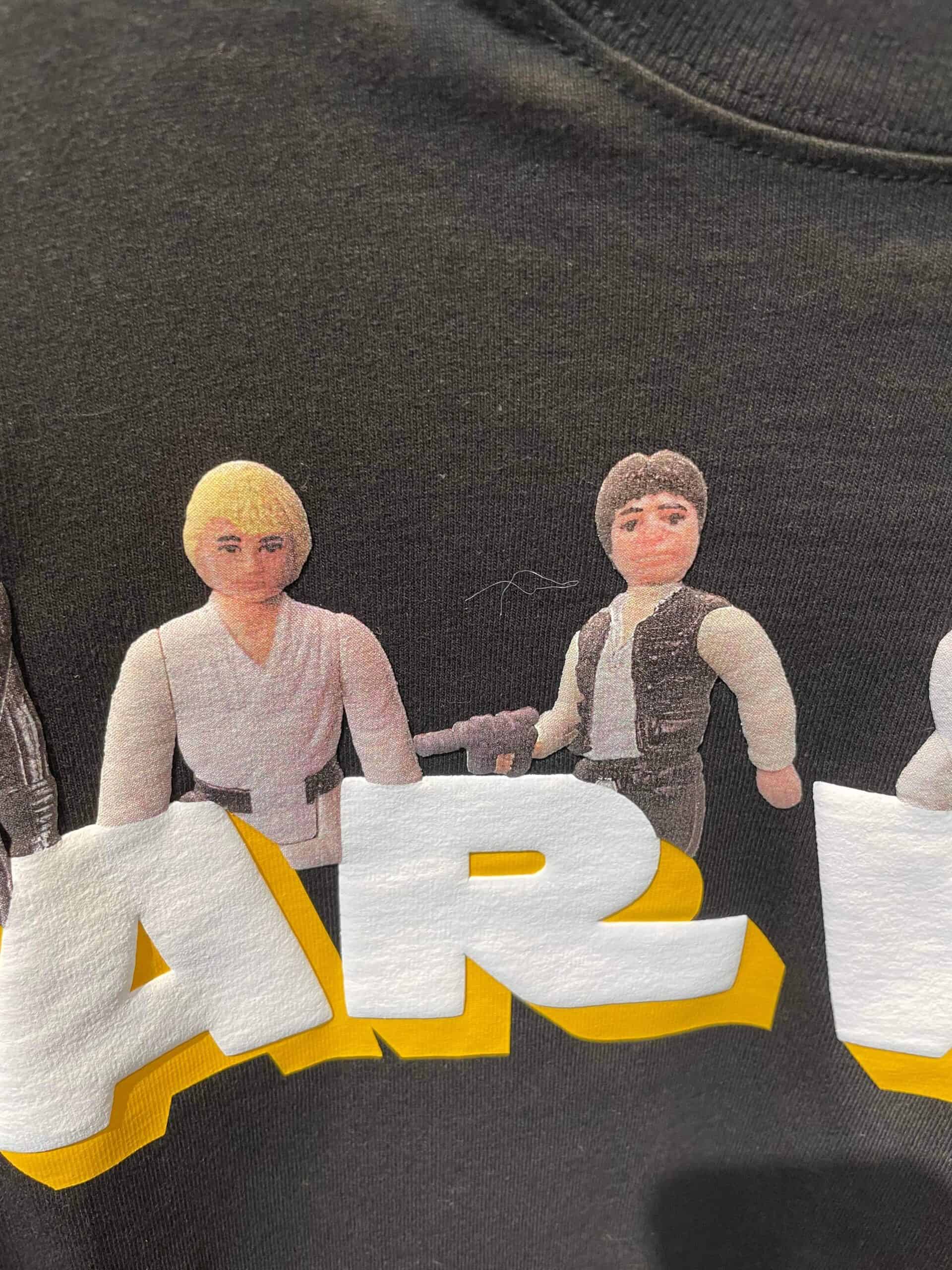 The main characters from the original films appear as vintage action figures above “Star Wars.” You can see a Stormtrooper, Darth Vader, Luke Skywalker, Han Solo, Princess Leia, C-3PO, Chewbacca, and R2-D2. This would be the perfect shirt for me to wear on cool summer evenings in Galaxy’s Edge. And, if the temperature doesn’t drop, it would still look super cute tied around my waist! It would also make a great gift for Father’s Day or for anyone who had the vintage action figures as a kid!