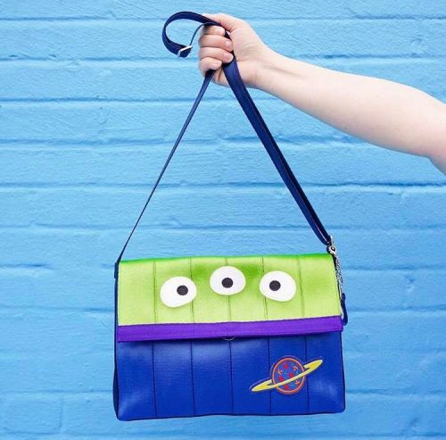 Next on the Green Alien theme, is the fold over crossbody. Color blocked straps come together with eyeball appliqués to create our favorite neighborhood Aliens from Pizza Planet.