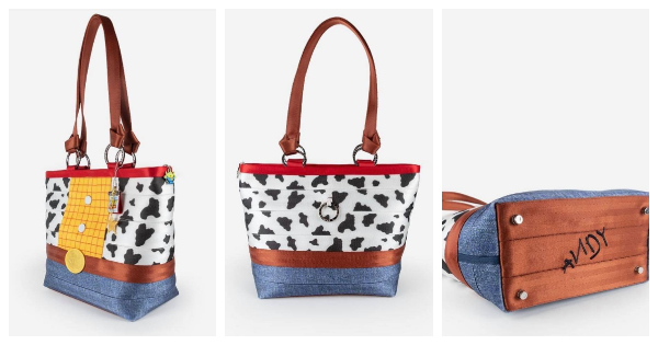 The Woody inspired bag is definitely full of details. From the cow print wrap around for his vest to the plaid front and denim bottom, Woody’s cowboy outfit is fully rendered in this character tote. That’s not where the details end though, the ring on the back of the bag mimics his pull-to-talk string, and “ANDY” is “written” on the bottom of the bag!