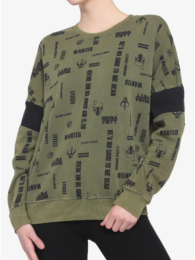 Keep cozy while collecting bounties with the Boba Fett Logos Sweatshirt! This green sweatshirt has an all-over print with Boba Fett’s helmet, Mythosaur skulls, and even his well-known quote, “He’s no good to me dead.” Boba Fett fans definitely need this in their collection!