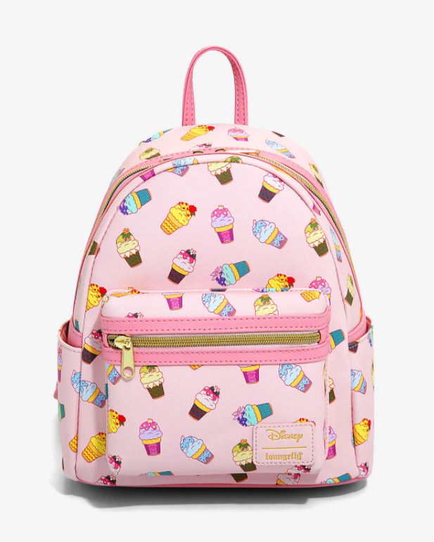 The Loungefly Disney Princess Ice Cream Mini Backpack is made of pink faux leather and features a toss print of princess themed ice cream cones. You can spot ice cream cones inspired by Rapunzel, Mulan, Cinderella, Tiana, Ariel and Belle! This mini backpack retails for $49.90.