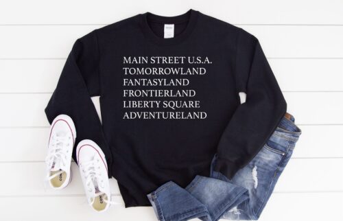 Each of The Magic Kingdom Lands offers guests a unique experience. From Main Street USA to Adventureland, there is magic waiting around every corner. This sweatshirt shows off all the different experiences waiting for you.
