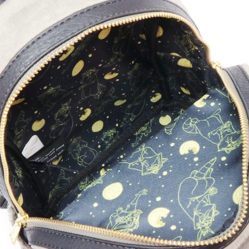 This cosplay mini-backpack is quite entertaining, and a must-have for Meeko fans. Pocahontas’ trusted raccoon friend is recreated with a short hair plush all over fabric. Appliques and embroidered details, that we have come to know and love from Loungefly recreate other iconic details. My favorite detail on the front of the bag is that the zipper pulls look like Meeko’s favorite biscuits. On top of that, the placement of his hands on the front pocket, make it look like he’s holding the delicious treats.