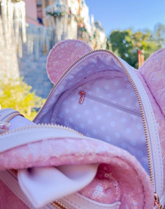 Stylish Disney Parks loungefly backpack with sequins, mouse ears, and bow for Disney fans.