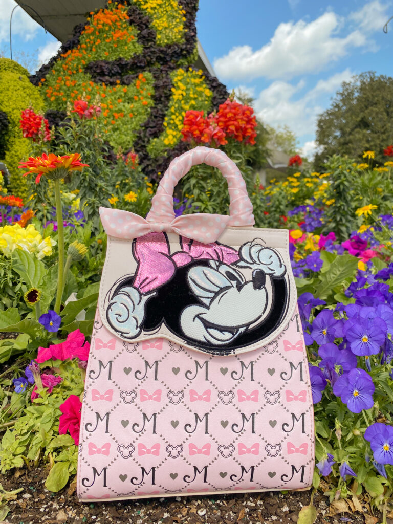 The first bag in the new collection is the Minnie 3D Cherry Blossom Crossbody. Now, Minnie Mouse herself can travel on your shoulder wherever you roam this summer. This light pink bag has small white and orange flowers all over it. The golden hardware complements the bag’s color wonderfully and reminds me of golden summer sunshine.
