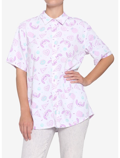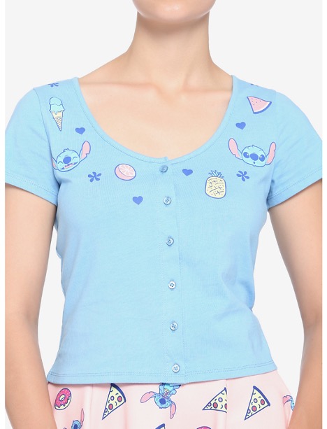 There’s even a Stitch Button-Front Crop Top! Emoji Stitches, tasty treats, hearts, and flowers dance around the neckline of this adorable summer look! The dainty buttons in the center of this top make it easy to dress it up or wear it as part of a more casual look.