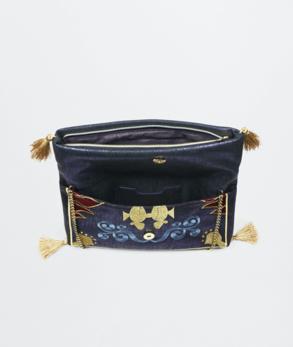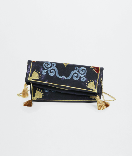 First up is this precious Magic Carpet Bag!  This stunning little fold-over bag is a wearable version of Carpet with embroidered details, gold tassels, and sparkly fabric that really show off the magic of this bag!  It also features a gold chain, a zipper on the main compartment, a snap closure on the flap, and an extra pocket with a card pocket on the front!  This little bag can hold all of your necessities while also looking adorable!  It’s almost like it is magic or something!