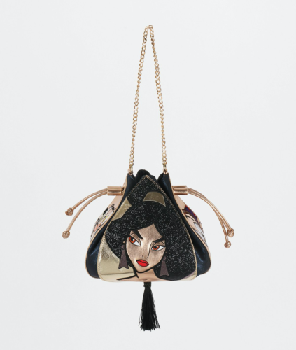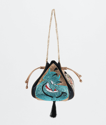 If you prefer something even more unique, check out this Aladdin 4-Sided Drawstring Bag!  This unique piece features different sparkly Character appliqués on each side of the bag!  You can spot Jasmine, Genie, Abu, and Rajah!  The gold cinch top closure, the gold chain, and the black tassel add even more magic to this bag!