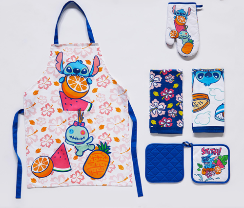 This collection includes a white Apron with a pink and orange tropical flower background print. It also features blue trim, fruit, Scrump on the front pocket and Stitch eating an orange popping out of the pocket! Although this apron is not currently available online, I hope it will come back very soon! The Pot Holders features Stitch excitedly playing with fruit along with the word “Stitch!” on one and Stitch climbing and licking the side of a drink along with the word “Sweets” on the other! The Oven Mitt features a fabulous pink floral print with a navy blue background on one side and the same image of Stitch and Scrump as the apron on the other. The Kitchen Towels feature Stitch with some steamed buns along with the word “yummy” and the other features the fabulous pink floral print!