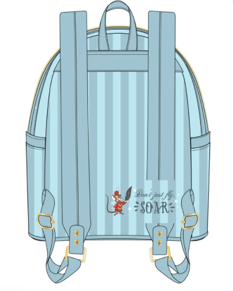 There is also, of course, a fabulously adorable mini backpack featuring Dumbo and Timothy Q. Mouse flying above the circus train carrying giraffes, lions, and hippos! You can spot the little train on the front zipper pocket, and the zipper pull is a gold feather! The back of the backpack features stripes, Timothy Q. Mouse, and the quote, “Don’t just fly, Soar!” Inside, you will find the same anniversary lining.