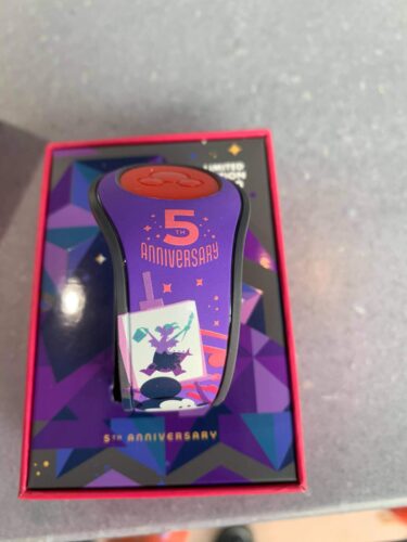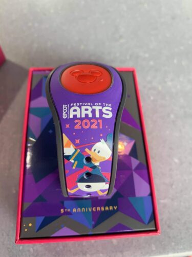 First up is this adorable Festival MagicBand! This stunning MagicBand comes in an amazing box that is artwork in its own right! The box features Mickey, Donald, Chip, Dale, and Figment all painting a fabulous painting of Figment, well, painting! It also features the festival logo on the side of the box. The Limited Edition MagicBand inside is even more gorgeous! With a red Mickey icon puck and a purple band base, it is super unique! One side features the words “5th Anniversary” along with the painting of Figment and Mickey himself! The other side features the festival logo along with Donald, Chip, and Dale! My favorite detail has to be Chip and Dale carrying the tube of paint!