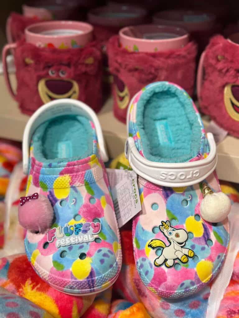 First up are the Crocs that I feel like are great for Spring! These adorable lined Crocs feature a lovely fluffy light blue lining, white trim details, and a precious allover pattern of colors that are made to look fluffy and represent fluffy Characters like Buttercup, Ducky, Bunny, Lotso, Sulley, Art, and Bing Bong! There is also an adorable pink pom Jibbitz with a polka dot bow representing Bing Bong and a “Fluffy Festival” Jibbitz with letters representing Lotso, Buttercup, Ducky and Bunny, Sulley, Art, and Bing Bong on one shoe, and a Buttercup Jibbitz and a white pom Jibbitz with a gold unicorn horn representing Buttercup on the other shoe!