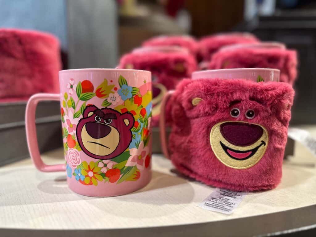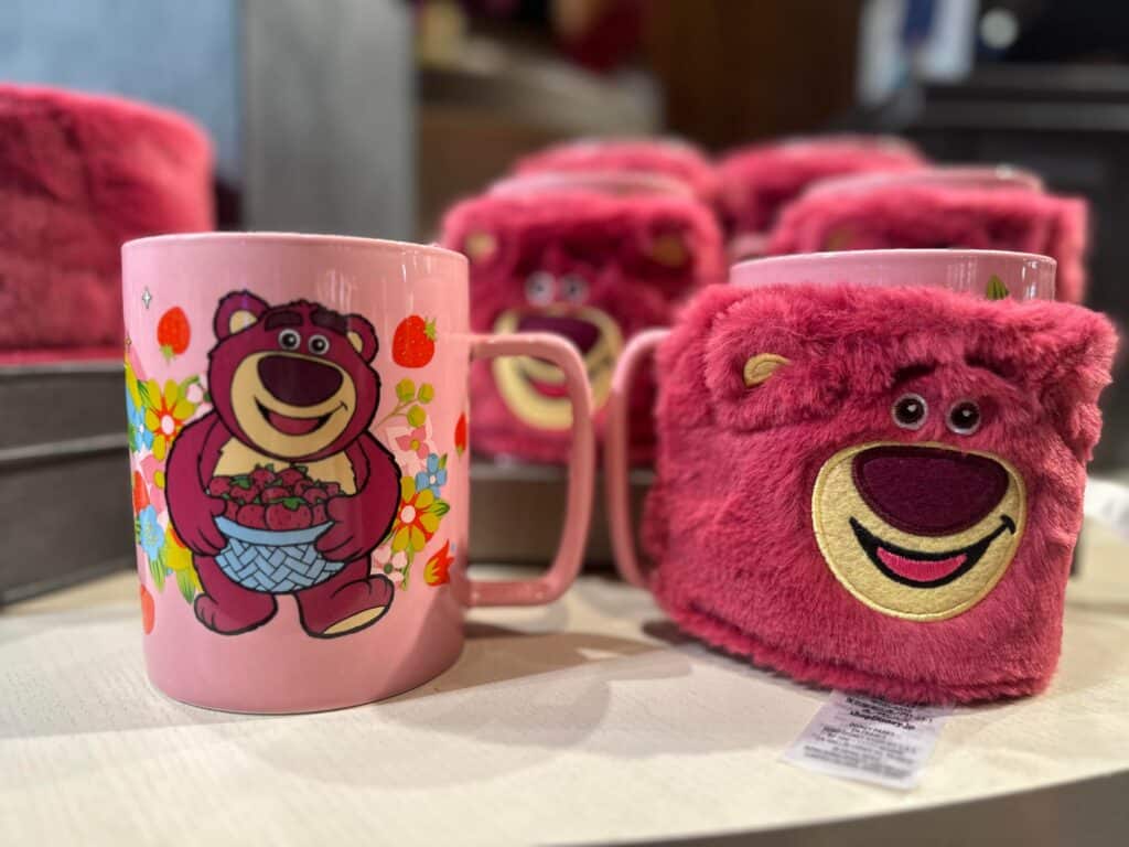 There is even a fluffy mug! This pink Lotso mug features an image of happy Lotso carrying strawberries on one side and an angry Lotso face on the other with a fabulous strawberry and flower background all the way around! The fluffy part is the fabulous wrap that attaches to itself to stay in place to keep your drink warm and your hands comfortable! It even features Lotso’s smiling face!