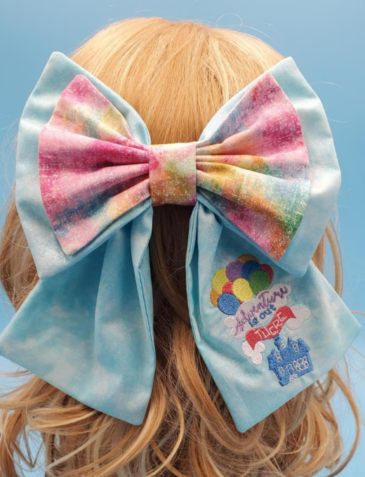 For fans of Pixar’s Up, the sky-blue bow with colorful balloon embroidery is pure joy. It captures the spirit of adventure that fits right in with Animal Kingdom’s theme of exploration. This one is especially fun if you’re DisneyBounding or traveling with kids who love bright, cheerful details.