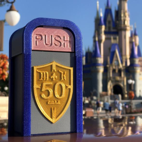 Speaking of desktop storage, check out this precious Desktop Trash Can! This trash can is fully functional like the others we have featured, but it has special 50th-anniversary touches! It has the same color palette as the newly painted Cinderella Castle and features a gorgeous “MK 50 ears” shield on the side!