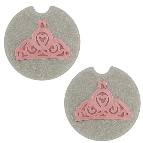 There are adorable classic symbol options like these Castle Coasters that feature a silk blue castle insert in a white marble base. There are also these adorable Tiara Coasters that feature a silk rose gold tiara insert with a hidden Mickey inside a glitter silver base!