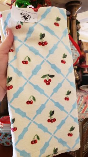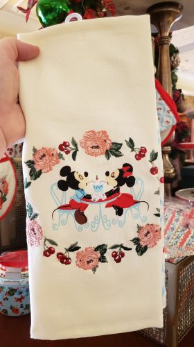 Next are these fabulous kitchen towels. I have pretty towels that hang on my oven as decoration (because let’s be honest–they’re too pretty to use), and I think these would be a lovely addition! The first towel features Minnie and Mickey enjoying a milkshake surrounded by flowers and cherries (including hidden Mickey cherries). The other towel features cherries, including hidden Mickey cherries, in an adorable pattern. There are even tiny blue hidden Mickeys!