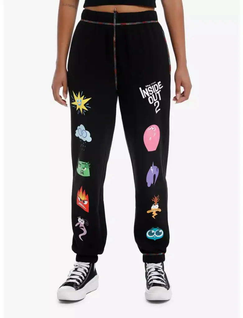 The final item in this collection is a pair of Inside Out 2 Sweatpants. All of your emotions appear to float around on the black background of the pants, just like they do in your mind. The vibrant colors of the emotions really stand out on the dark pants. It’s almost like I can feel them. Joy is a sun on the pants and she is trying her best to shed some light on sadness’s raincloud. You are also really drawn to Envy’s deep soulful eyes. They were the first thing that I saw when I saw these pants. Finally, they are cinched at the ankle, which saves short people like me from tripping on the pant legs and feeling Embarrassed.
