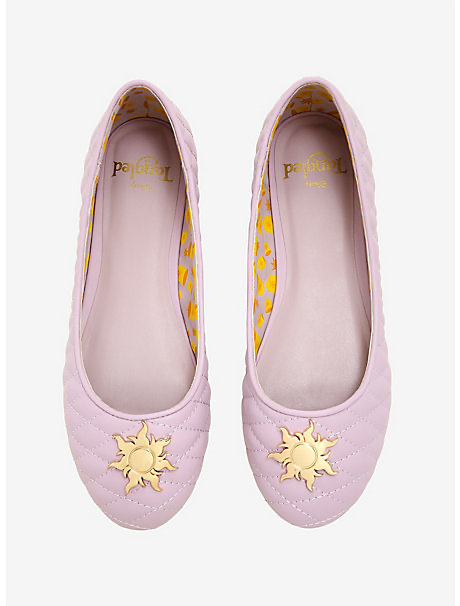 These Tangled Lavender Quilted Sun Flats are next! These romantic lavender quilted flats feature a gold-tone Corona Sun emblem at the toe and an allover pattern of floating lanterns on the interior lining! Even your feet will see the light with these shoes! The Disney Fashionista herself has these and loves them!