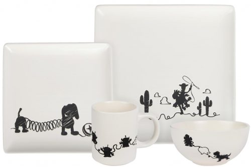 This contemporary set is cute and quirky! The white ceramic 4-piece set features unique “scribble” silhouettes of popular Toy Story characters. You’ll find Woody, Slinky Dog, Mr. Potato Head, Hamm, Rex, and the Little Green Men aliens all featured across the designs.