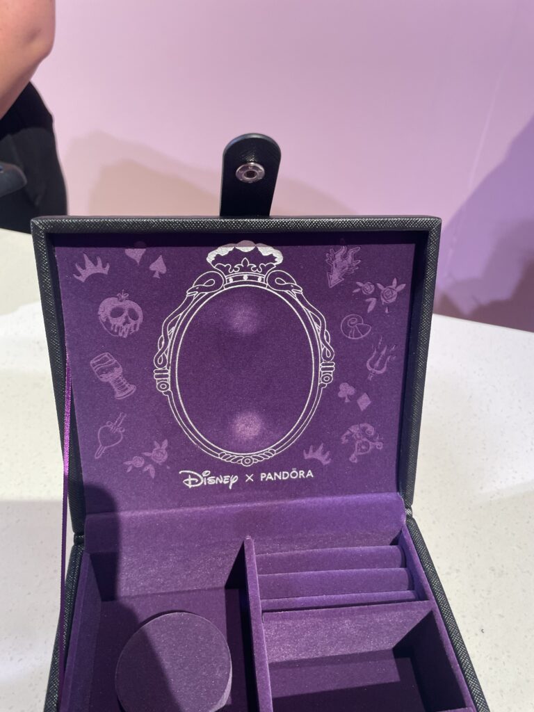 At the expo, if you purchase the 4 villain charms, you receive a limited edition jewelry box. With a black exterior, once you open it up, you’re greeted with a royal purple interior. The lid features a removable mirror, and shadowed outlines of the villains in the front boxes. This is the perfect travel case for your Pandora jewelry! If you’re not at the expo, no worries. Since this is an early release, there is hope for the jewelry box to release at the parks and online.