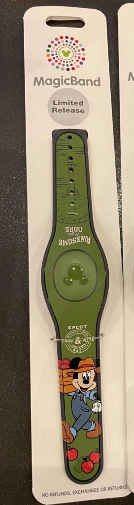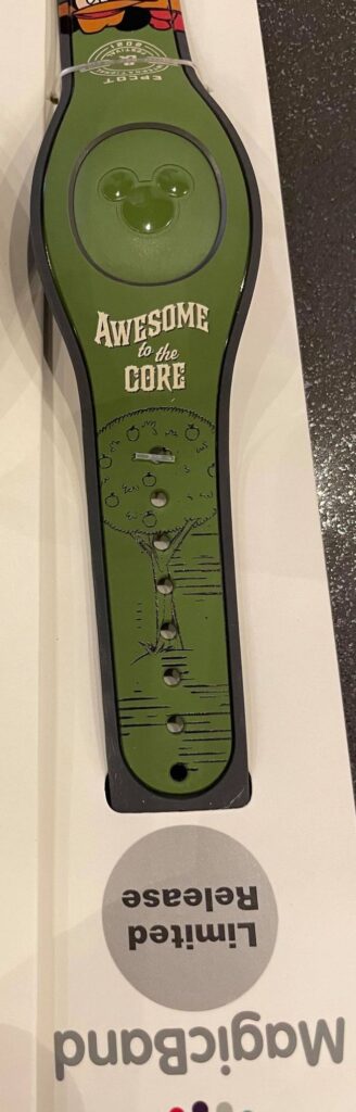 There is a green Limited Release MagicBand featuring the words “Awesome to the Core” and an apple tree on one side and Mickey carrying apples with the festival logo on the other.