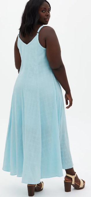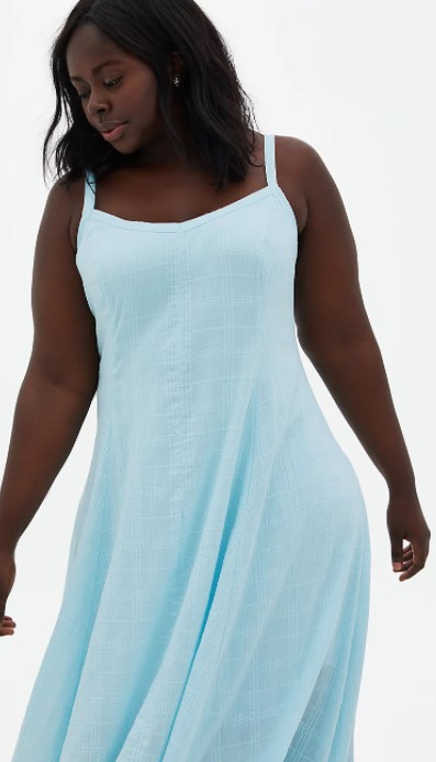 This light blue trapeze maxi dress is perfect for hot summer days and nights. The lightweight dress features breathable cotton that beautifully drapes over your curves. Plus, this color is perfect for representing Cinderella’s iconic ball gown! You can find this summery Cinderella-inspired dress on Torrid.