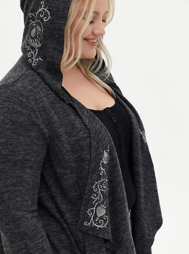 This super soft Plush Embroidered Cardigan has made its way onto my wish list! This cozy gray cardigan features embroidered details on the draped open front and on the hood. You can spot thorns, a heart with a dagger through it, and the Poison Apple!