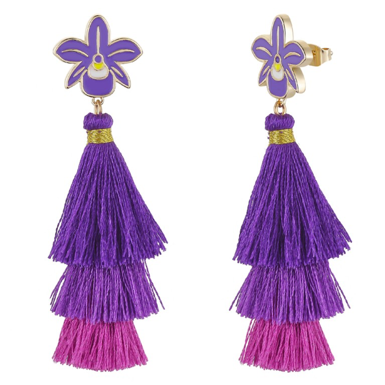 For a more colorful look, there are these Encanto Tassel Earrings featuring purple orchids with multi-hued purple tassels hanging from the bottom!