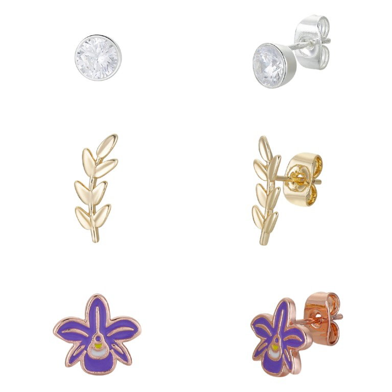 There is also this Encanto Earring Set featuring silver crystal studs, a gold leaf pair, and a purple orchid pair!