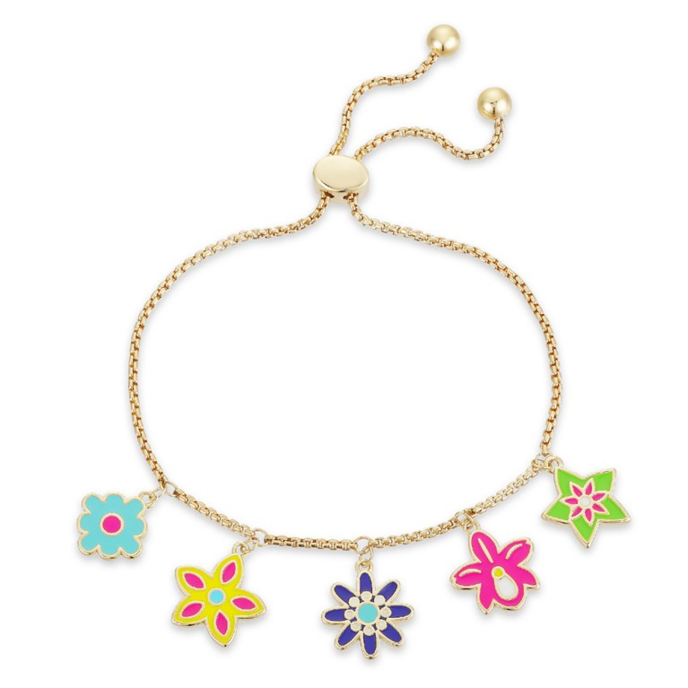 Next is this Encanto Bolo Charm Bracelet featuring five fabulous flowers in gorgeous bright colors on a gold chain!