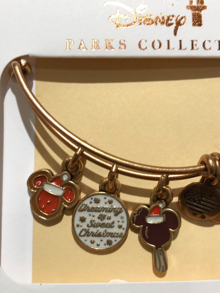 This precious bracelet includes three different charms. There is a Santa Mickey sugar cookie complete with red icing, sprinkles, ears, and a Santa hat, a disk charm featuring the words “Dreaming of a sweet Christmas” on a white background along with plenty of pixie dust and snowflakes, and a Mickey ice cream bar charm also featuring a little Santa hat! I love that you can see the wood grain details on the stick and a little nibble taken out of an ear! Plus, if you live in a warmer climate, you have stopped dreaming of a white Christmas, so a sweet Christmas is the next best thing!