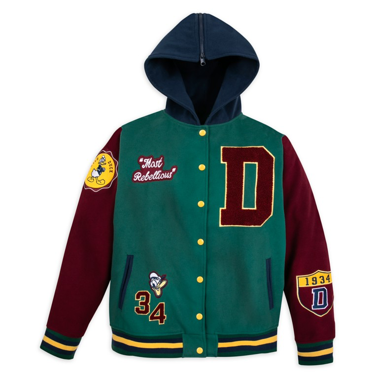 First up is this precious Donald Letterman Hooded Jacket! This classic collegiate coat style features a chenille “D”, a “Most Rebellious” appliqué, a Donald face appliqué, and the number 34 on the front representing Donald’s debut! There is a woven “Donald Duck” patch on the right sleeve and a “1934” patch on the left sleeve! The hood features a zipper that can unzip to reveal “Donald Duck” written across your back shoulder!