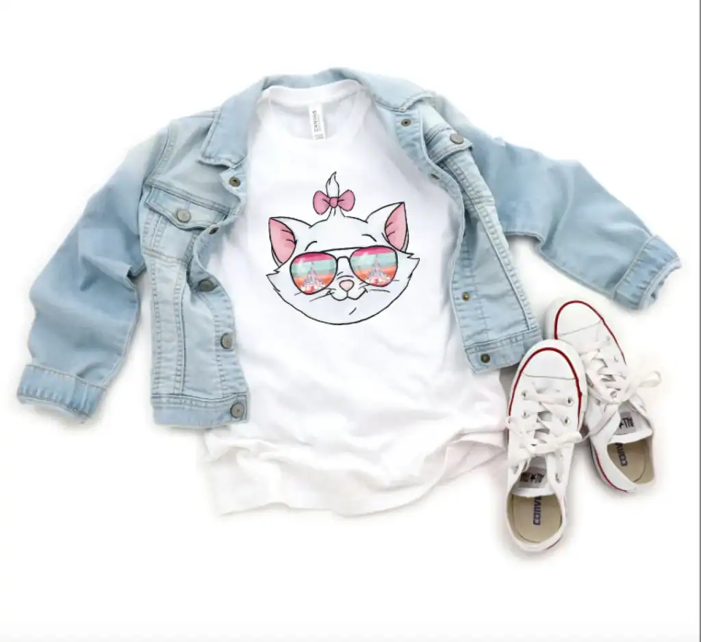 This cute and casual Marie inspired shirt is available in sizes for the whole family. Sizing ranges from 12 months to Unisex XXXL. In addition, these shirts are made with sublimation ink instead of vinyl. This gives your shirt a lightweight feel, which is exactly what you want for a hot Florida day.