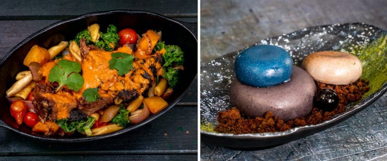Over on the West Coast at Disneyland Resort, you can grab some Ishi Tie-style Pasta with Braised Beef Bantha (Beef pot roast, coconut curry sauce, pasta, and mixed vegetables) or some Vintian Mineral Mousse (Banana brûlée-centered dark chocolate mousse, strawberry mousse, vanilla chantilly, chocolate crumble, and cherry garnish) at Docking Bay 7 Food and Cargo.